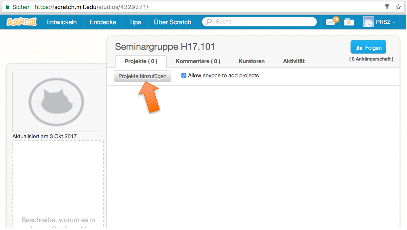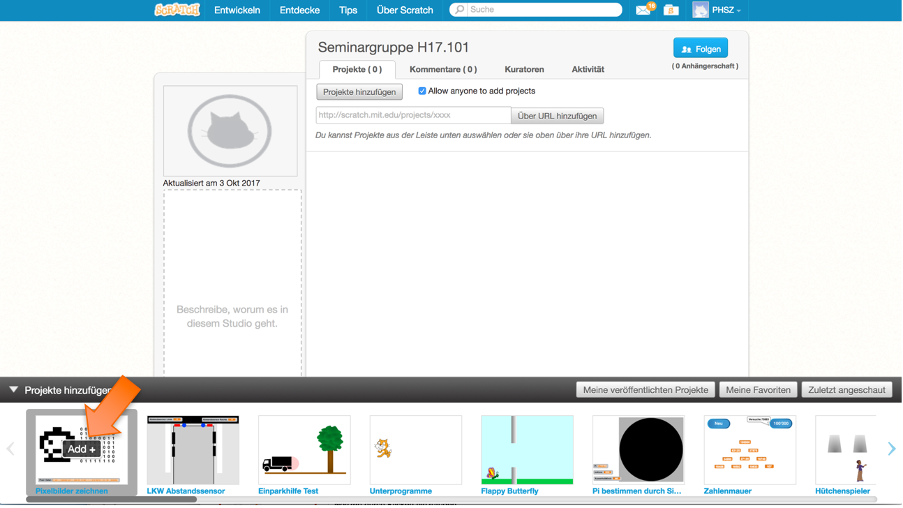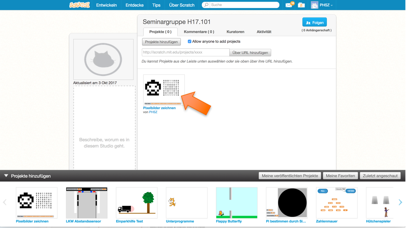- Hinweis: Bei Studios zeigt Scratch nur maximal 50 Projekte in der Übersicht an. In der Aktivitätenliste sehen wir aber auch die bereits früher abgegebenen Projekte. Macht euch somit keine Sorge, sollten eure bereits eingefügten Projekte nicht mehr angezeigt werden.